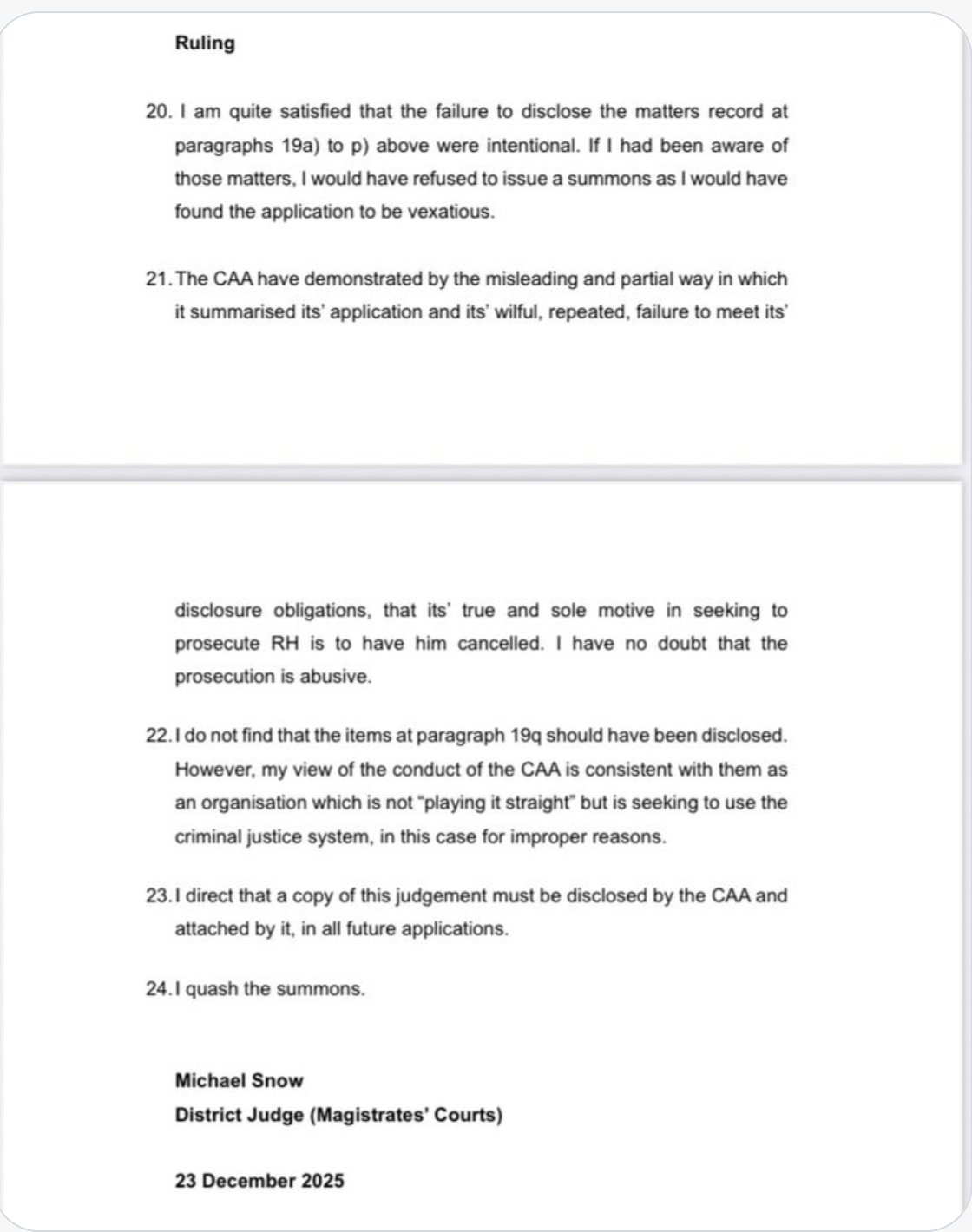 The Judge has ruled that the CAA intentionally failed to disclose relevant information when seeking the summons and if he had been aware of this information he would have considered the application for the summons to have been "vexatious." The Judge made it clear that the CAA's "wilful, repeated, failure to meet it's disclosure obligations" demonstrated that their true motive was simply to get Hunter cancelled, adding "I have no doubt the prosecution is abusive... My view of the conduct of the CAA is consistent with them as an organisation which is not playing it straight," and are using the criminal justice system "for improper reasons"